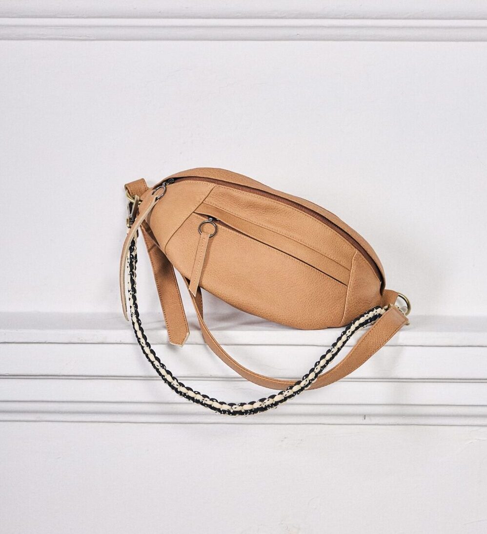 Crafted in soft leather with an adjustable strap for maximum comfort. Front, back, and interior pockets for impeccable organization. Cotton lining with Shipibo print. Handwoven adornment, removable for personalized style. Lightweight and functional for your daily adventures!
