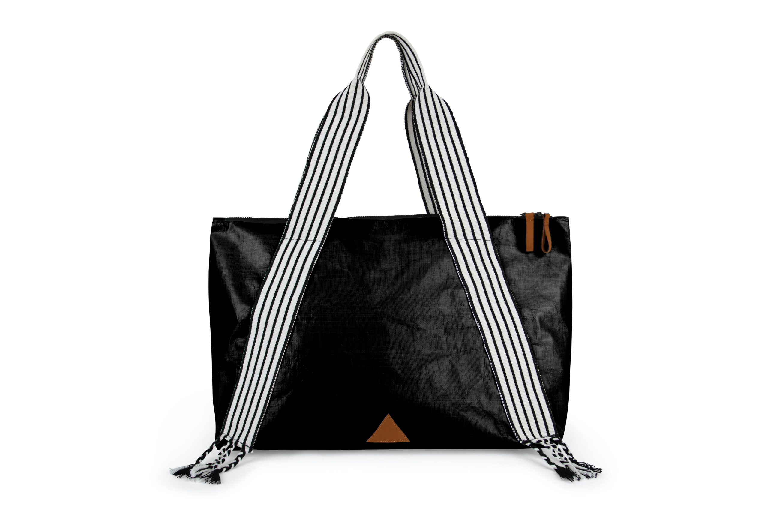 Elegant and waterproof. Woven handles representing the sash of the Peruvian northern marinera. Interior pocket, double-way closure, and leather details for a unique style. Ideal for the modern and active professional!
